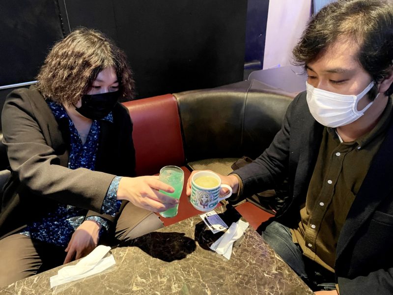 ドリンクが届いたので、とりあえず乾杯。しゅんはノンアルのカクテルで、山田は梅昆布茶です。