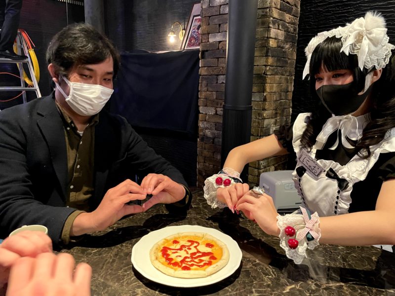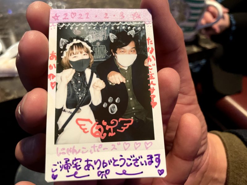 最後にチェキを撮ってもらいました。手でハートを作るのですが、「ご主人様、コロナ対策で非接触にしておりますので、指はつけないようお願いいたします」と言われて非接触。