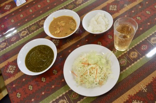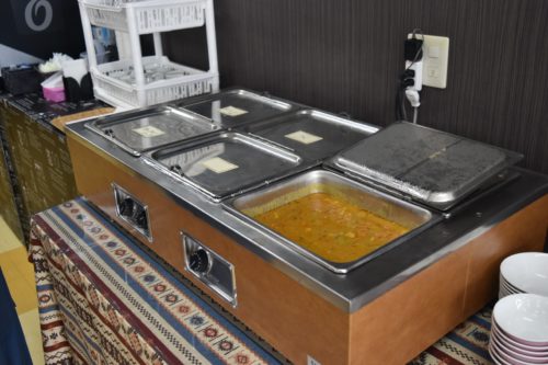 「パンジャブレストラン」では平日に限り、インドカレー3種類がなんと食べ放題! この日は、「ホウレンソウカレー」「チキンカレー」「ヤサイミックスカレー」がたっぷり用意されていました。熱々のカレーを堪能できます。