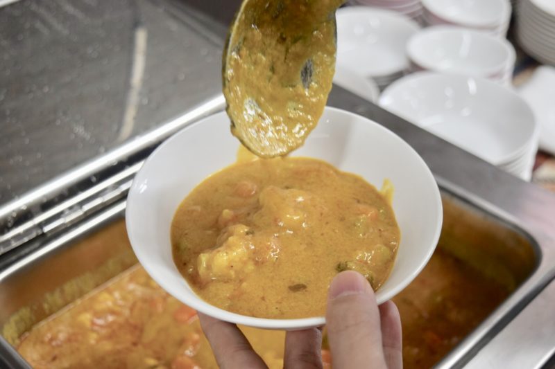 カレーのほかにも、サラダ、ライス、スープ(この日は「チキンタマゴスープ」でした)、ドリンクも食べ飲み放題! これで大人850円はお得です。10歳以下のお子さんはワンコイン500円とのこと。安すぎ……。