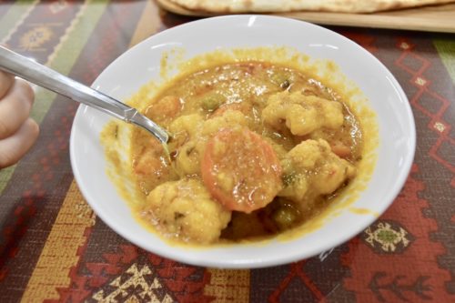 大きい。腕の長さと比較してもナンの方が大きい。香ばしくてモチモチなので、何枚でもいけそう…!と思いましたが2枚が限界でした。