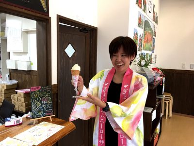 「まずは食べてみて!」とそのソフトクリームを勧めてくれたのが、玉東町地域おこし協力隊員であり、ぷらっとぎょくとうスタッフ兼デザイナーでもある永田さん。