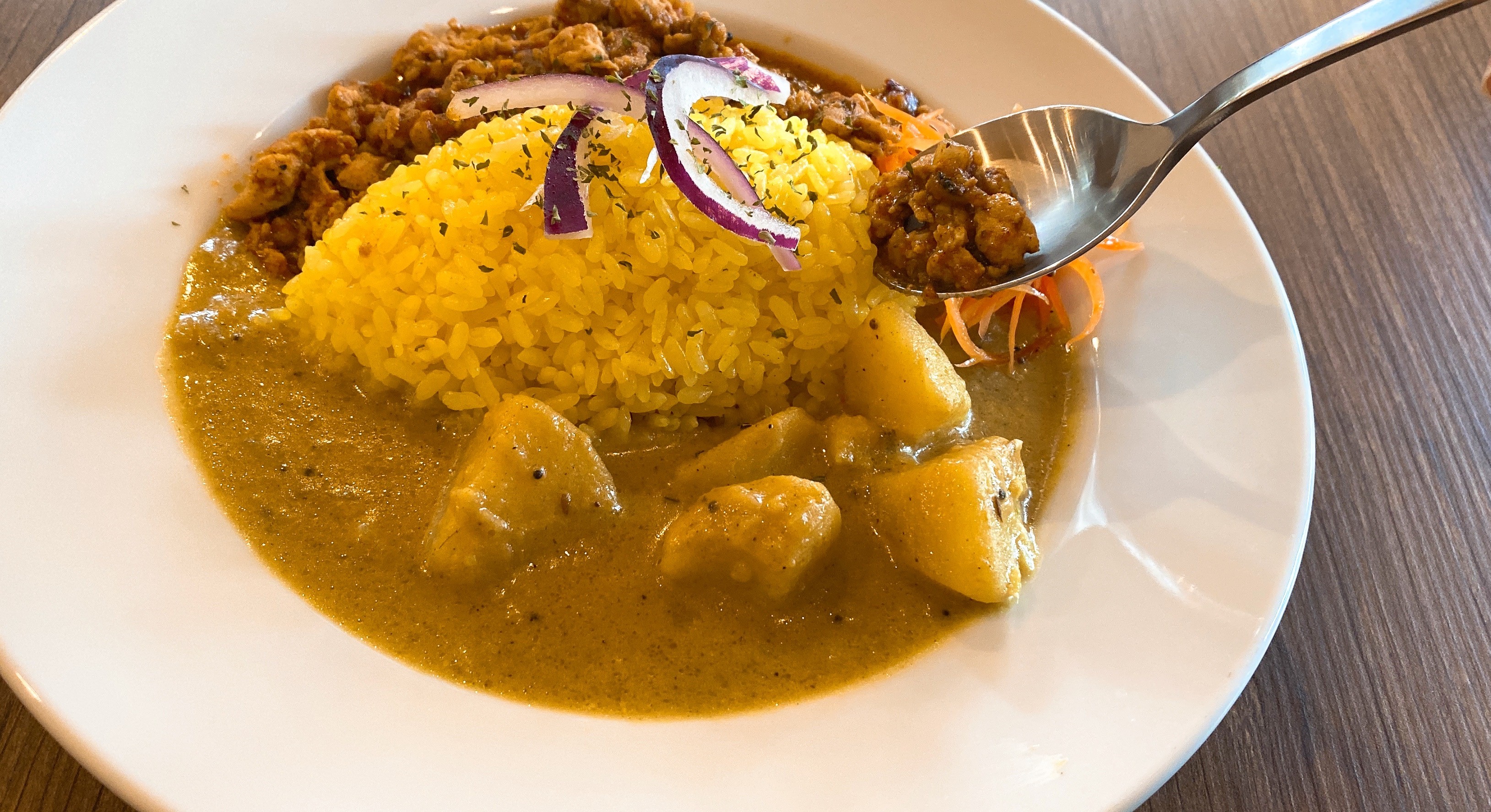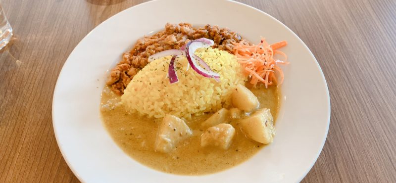 こちらが、鶏肉のキーマカレーとじゃがいものカレーのあいがけ。サフランライスがうれしい。