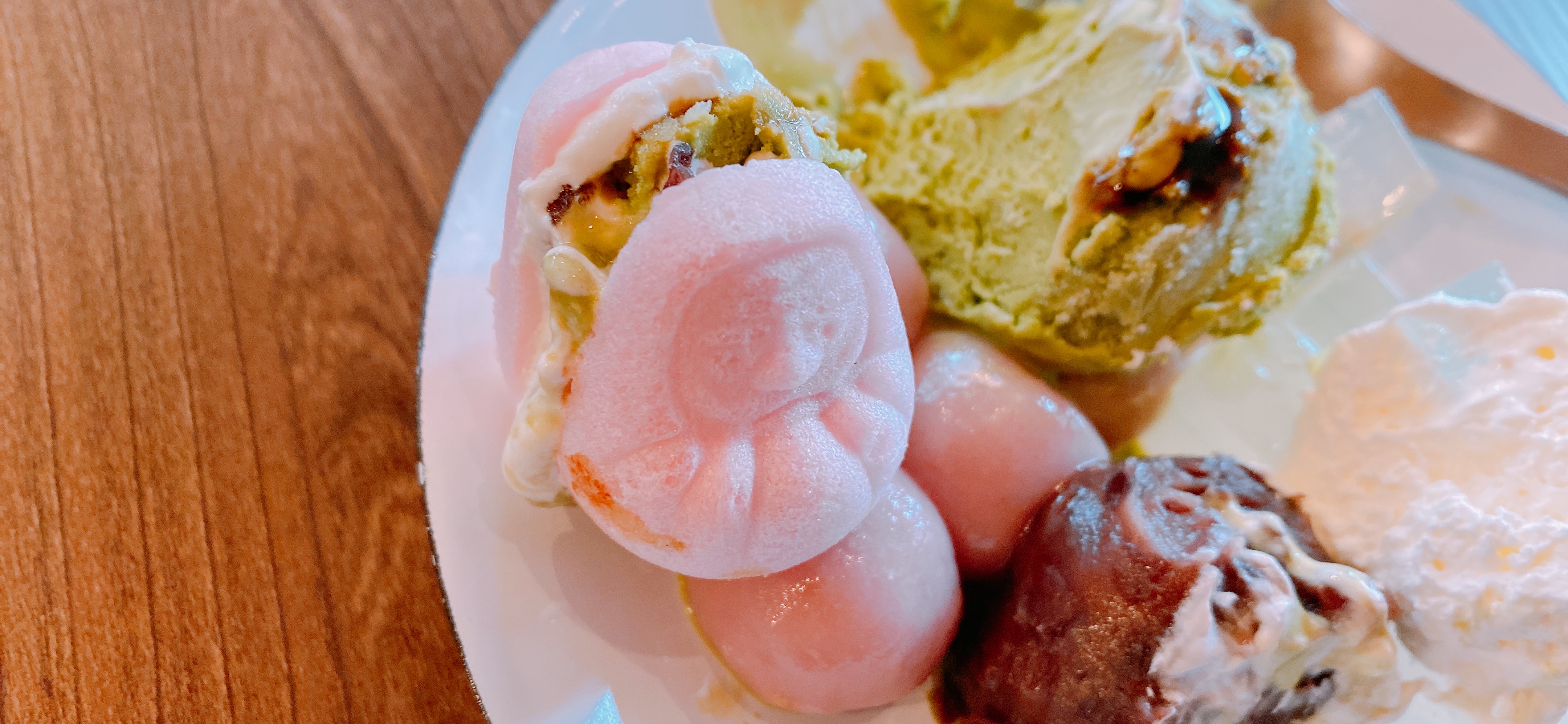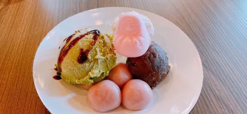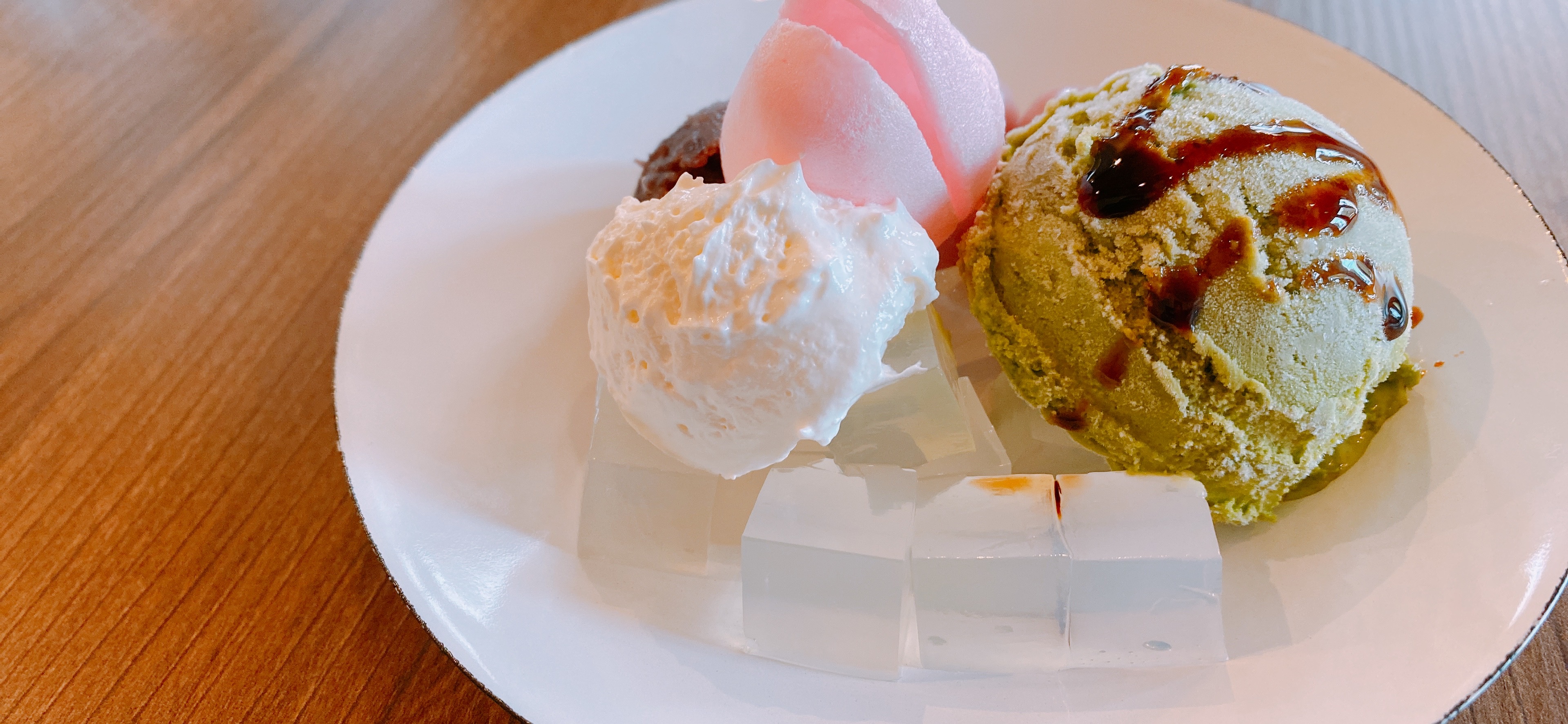 なんとオシャレなあんみつ。だるまさんの形のモナカがカワイイ。