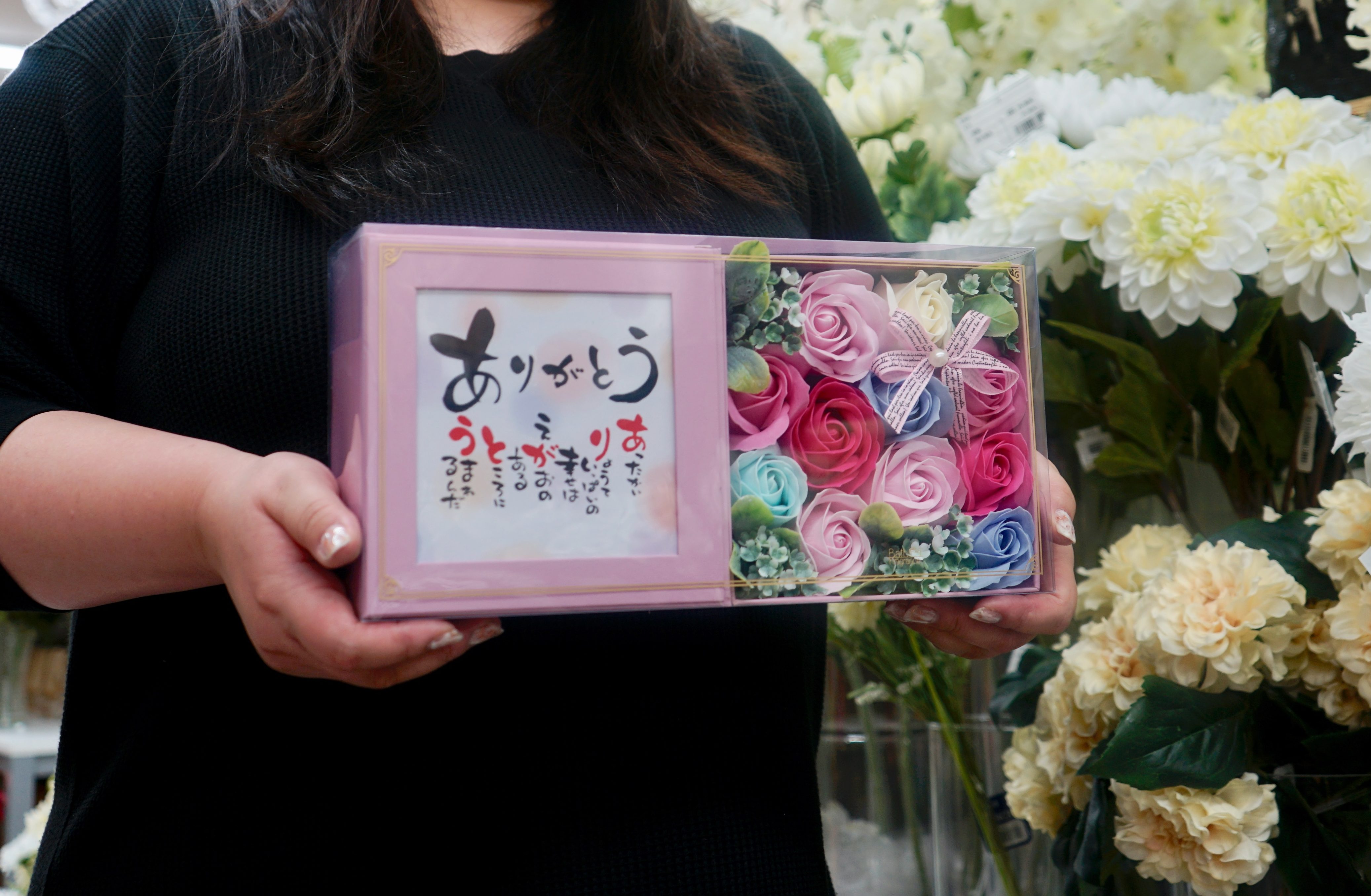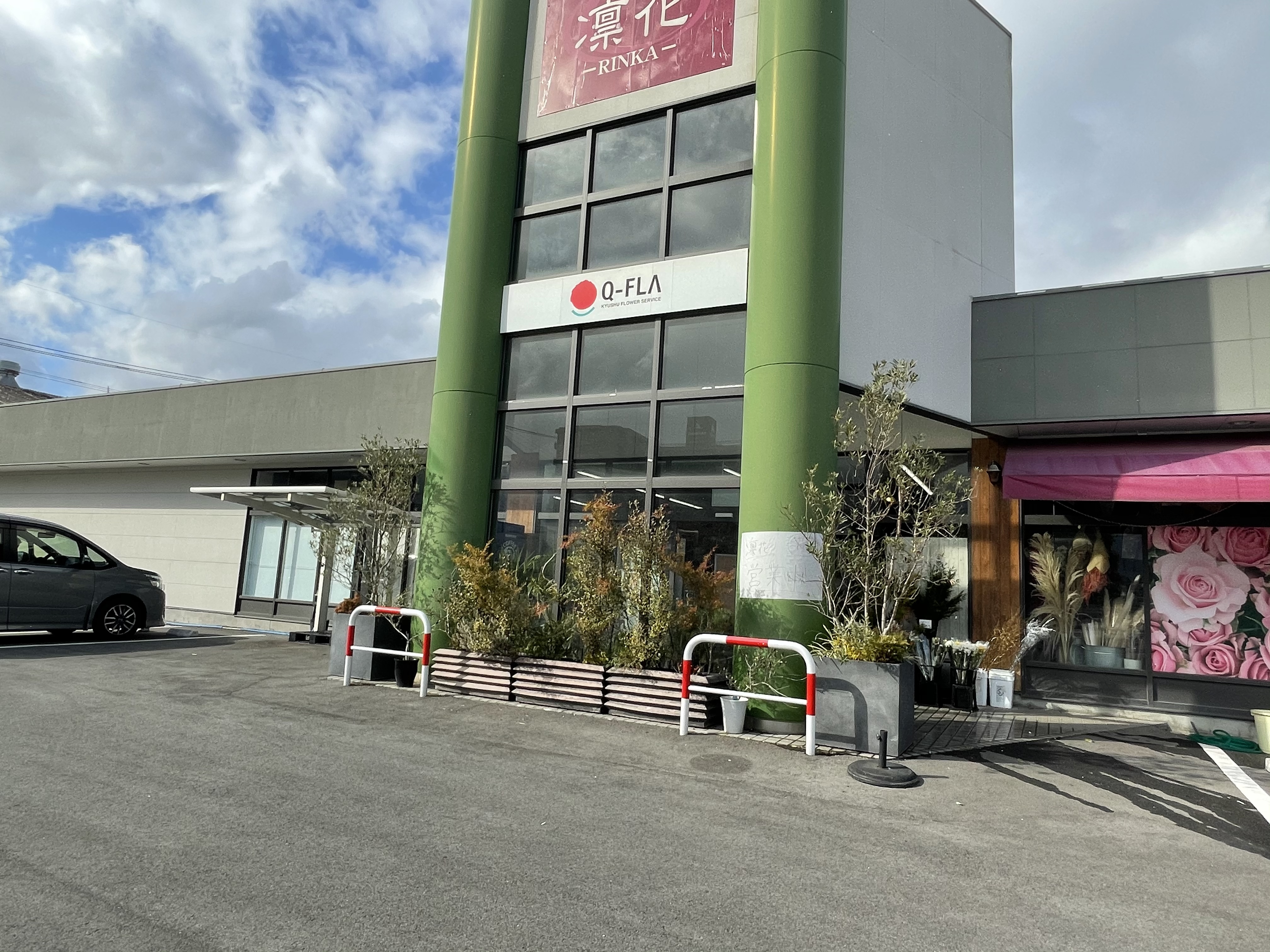 そこが、ゆめタウンはませんのそばにある「Q-FLA(キューフラ)」。熊本に本社があり、全国の雑貨屋さんに雑貨のパーツやアレンジフラワーグッズを卸している会社なんです。