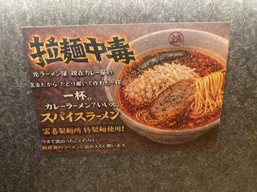 裏にはこう書いてあります。「元ラーメン屋、現在カレー屋の店主だからこそたどり着いて作れた一杯。カレーラーメン?いいえ。スパイスラーメン」
