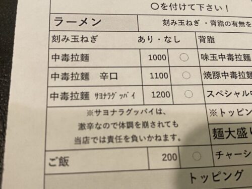 刻み玉ねぎ、背油の有無や辛さを選ぶことができます。