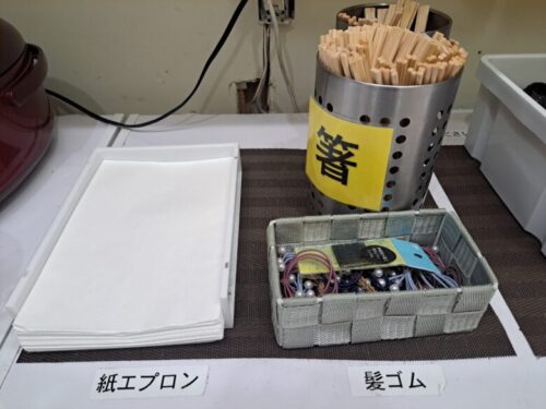 その他服を汚したくない人や髪が長い人用に、紙エプロンや髪ゴムもあります。