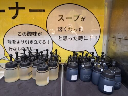 汁なしラーメン用のお酢や「カエシ醤油」もここで持っていきましょう。