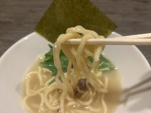 普通の麺より多めに水分を含んでいるので、太くてもちもち。食べ応えがあってスープとの相性も抜群です。
