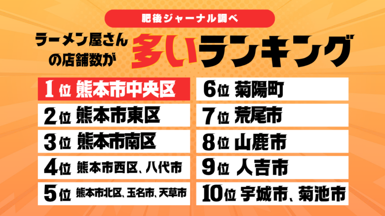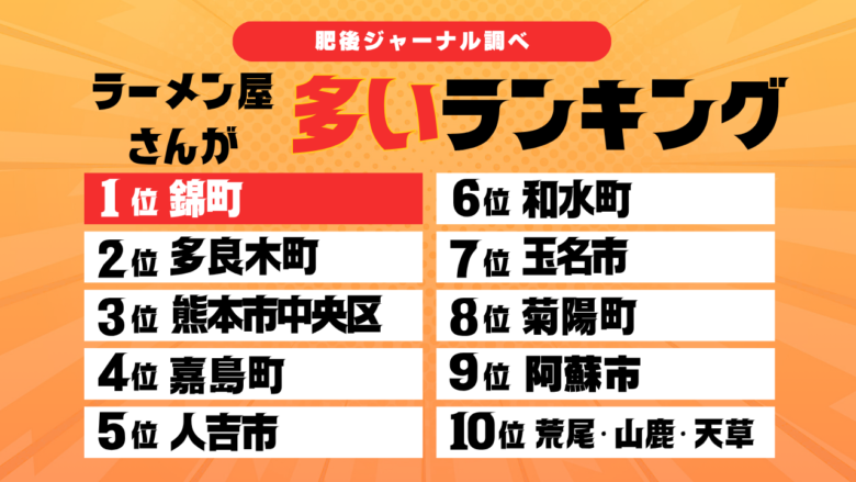 菊陽は人口別でもランクインしていたので、実はラーメン好きが多い町なのかもしれませんね。
