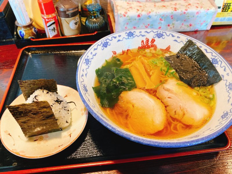 昼食を注文しました。醤油ラーメンの透明感とわかめと海苔が鮮やか!そして厚切りチャーシューが2枚ヒジキ入りおにぎりにパリパリの海苔がシャキーン。