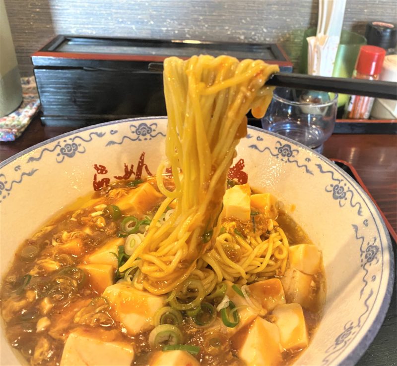 こちらもたまご麺。あんかけラーメンのようにトロミがあり、ピリッと辛い。寒い日には温まります。麺を食べた後にマーボー豆腐を食べていると、ご飯をかけて食べたくなります。