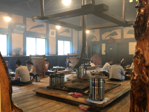 待っている間に店内をチラッと覗けば、真ん中に大きい囲炉裏が!!! 古民家の店内には、燻製のような香りと煙が漂っています。
