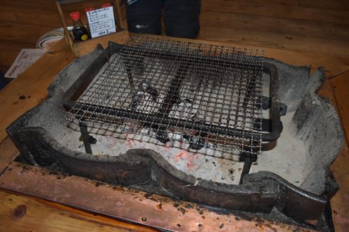 通された席は、小さな囲炉裏の前。自分で地鶏を焼いていくそうです。