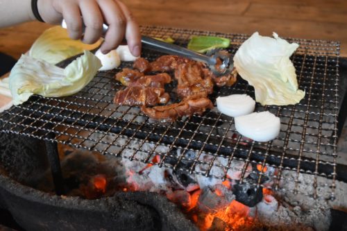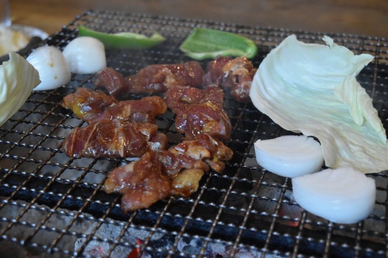 定食には、野菜盛り合わせが付いてくるので、一緒にじっくり焼いていきます。室内BBQのようになってきました。モクモク煙の香りが食欲をそそります。