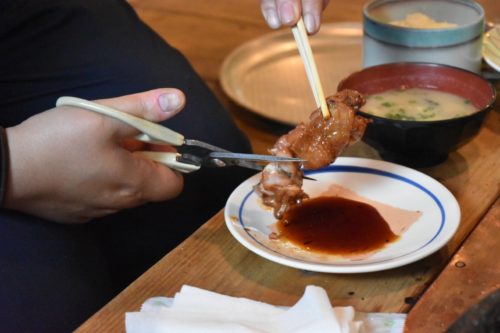 焼けたら、一つひとつが大き過ぎるので、食べやすいようにキッチンバサミで切ります。この時に面倒くさがって、切らずに一口で食べようとすると、噛めずにしゃべることができません。必ず切りましょう。