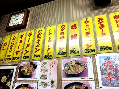 看板メニューの熊本ラーメンを始め、焼豚・みそ・もやし・わかめ。それに加え熊本らしい高菜ラーメンや、カレーラーメンという変わり種あります!。