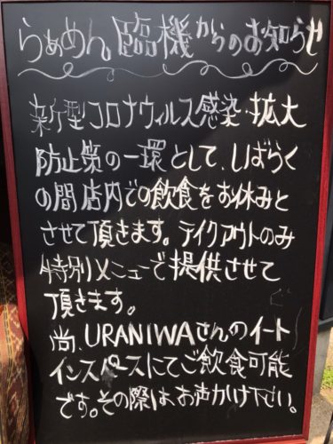 通常は、醤油系のらぁめんや、魚骨白湯らぁめんなどを店内で食べることができますが、新型コロナウイルス感染拡大防止のため、4月9日からテイクアウトのみの営業になりました。