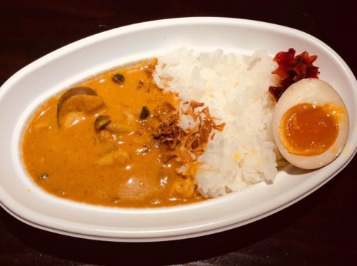 シーフードカレーは、魚介のこくが存分に出ていて、スパイシーなのに、こっくりとまろやかな味わい!ナスやシメジなどの具もたっぷりで、これに味玉までついてくるのが嬉しい限りです!