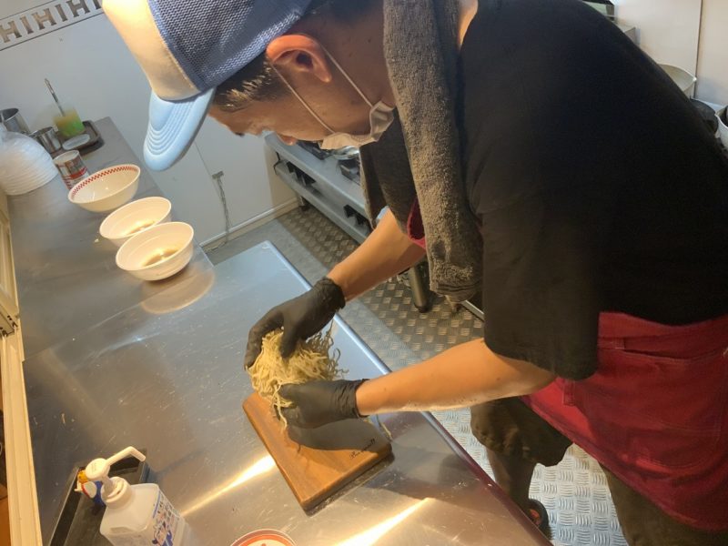 ストレート麺を茹でる直前に、手作業でスープの絡みやすいちぢれ麺にしていました。