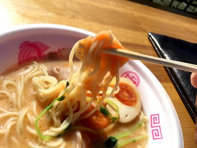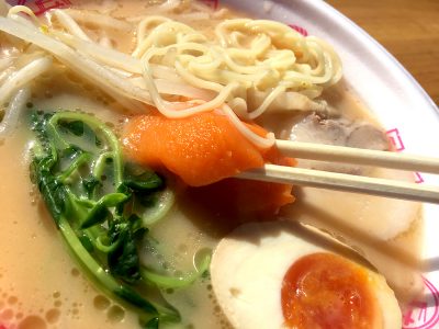 熊本人にとっては馴染み深いの味千ラーメンですが、今回のイベントでは尚絅女子大の生徒との共同企画した、菊陽にんじんピューレを加えたヘルシー「味千白とんこつラーメン」という新商品を提供!