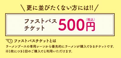 また、ユニークな試みとして、ラーメン待ちの行列を避けたいと思う方は、+500円で行列とは別に優先的にラーメンが買えるファストパスも販売!