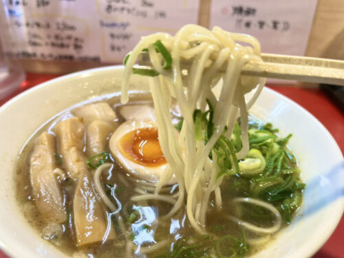 もちもちしたストレート麺に出汁の効いたスープがからんで、ツルツルン!といけます。
