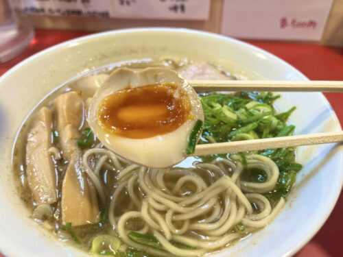 塩味を感じる半熟卵が、口の中でトローリとろけてインパクト大です。ネギもたっぷり!