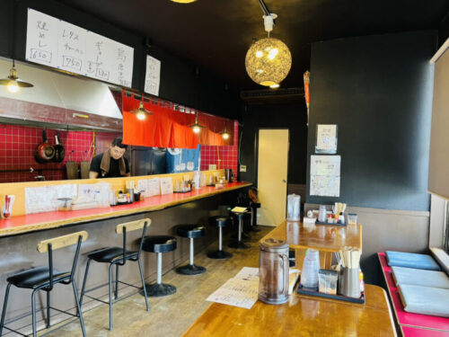 赤と黒をベースにした内観。カウンター席が10席とテーブル席が2つ。