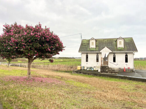 ピンクの花がたわわに咲く木と、広大でのどかな田んぼが一面に広がるところに