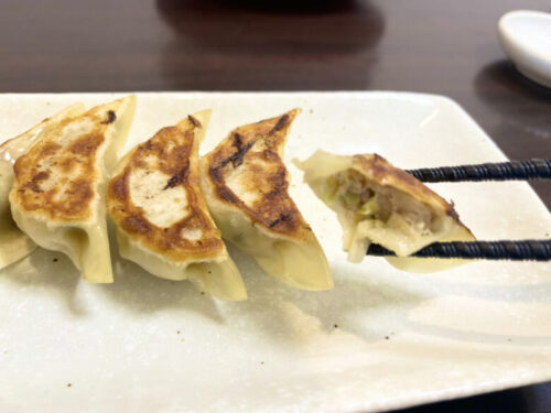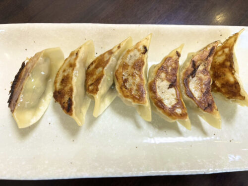 こんがりと香ばしく焼けた7個の餃子がついています。