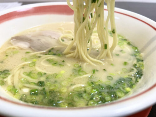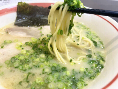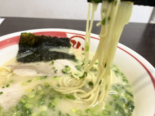 細いストレート麺にとんこつスープがしっかりと絡みついて