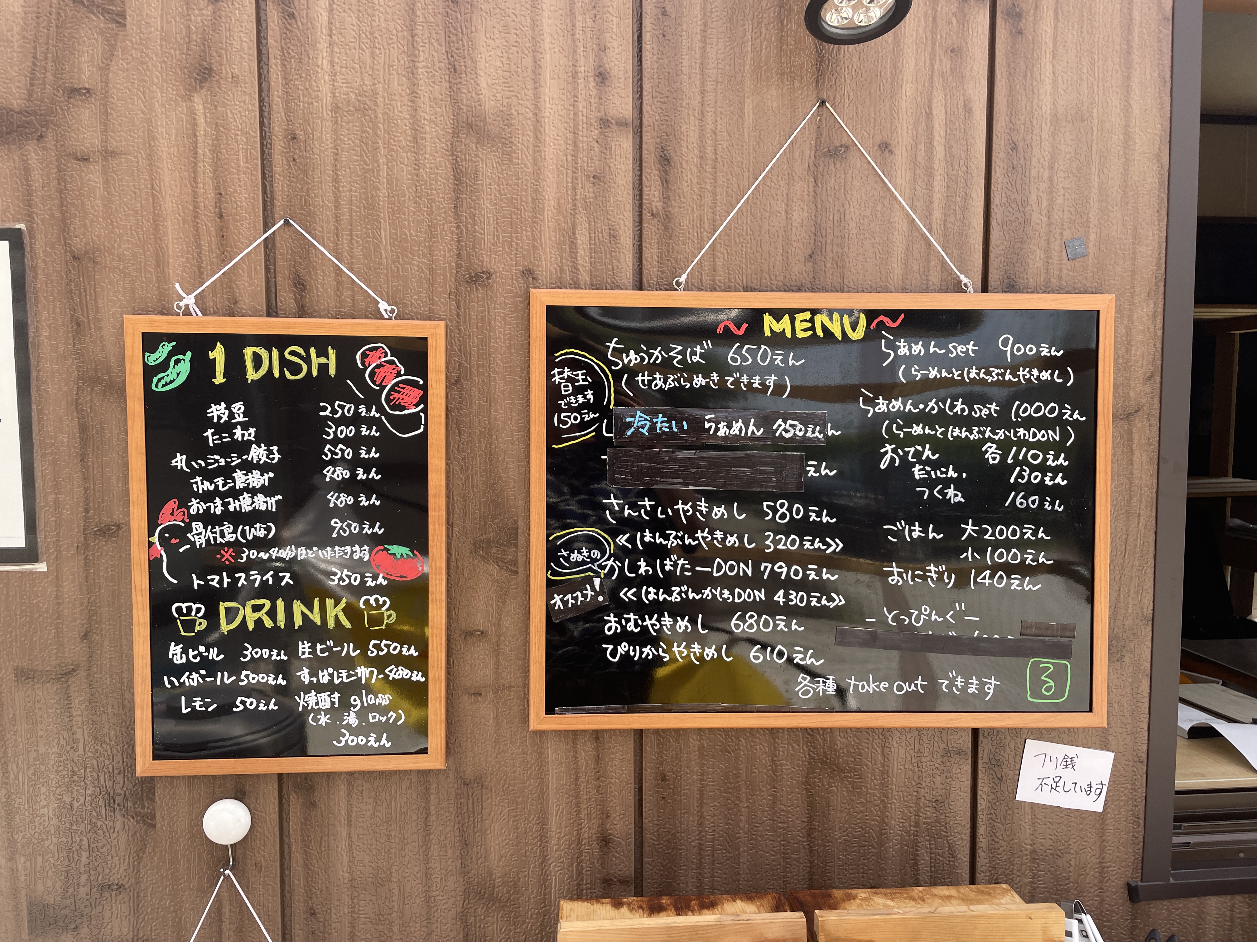 看板メニューの中華そばの他に冷たいラーメンやチャーハン、さらにおでんなどのサイドメニューも充実しています。