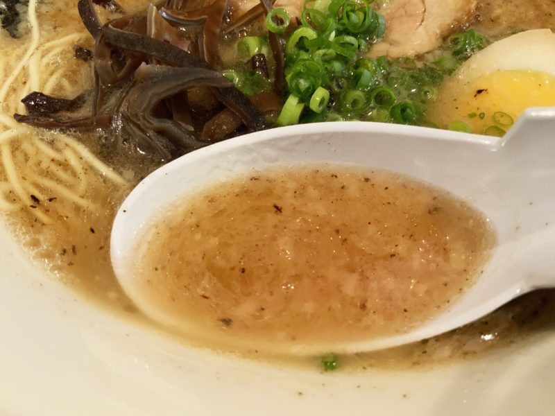 スープは透き通った豚骨スープで、今回は「こってり」なので、にんにくと背脂がたっぷり。