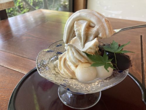出てきました!白玉、餡子、黒密、きな粉が盛られていてこれぞ和。緑の木々と合わせると、さらに風情を感じることが出来ます。ソフトクリームは、ノーマルなバニラ味にも変更出来るそうです。