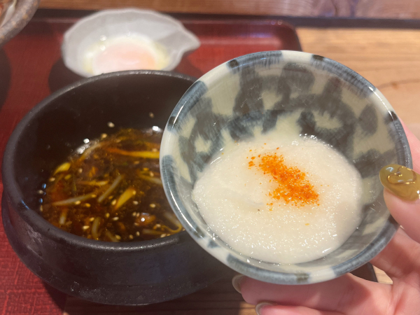 味変用に山芋とろろと温泉たまごも付いています。これがまろやかになってまた美味!
