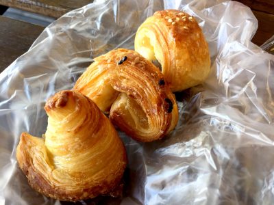 クロワッサンは1g3円のパン(1個20円程)。栗クロワッサン、鹿児島焼いもあんのクロワッサン、プレーン味のミニクロワッサン。