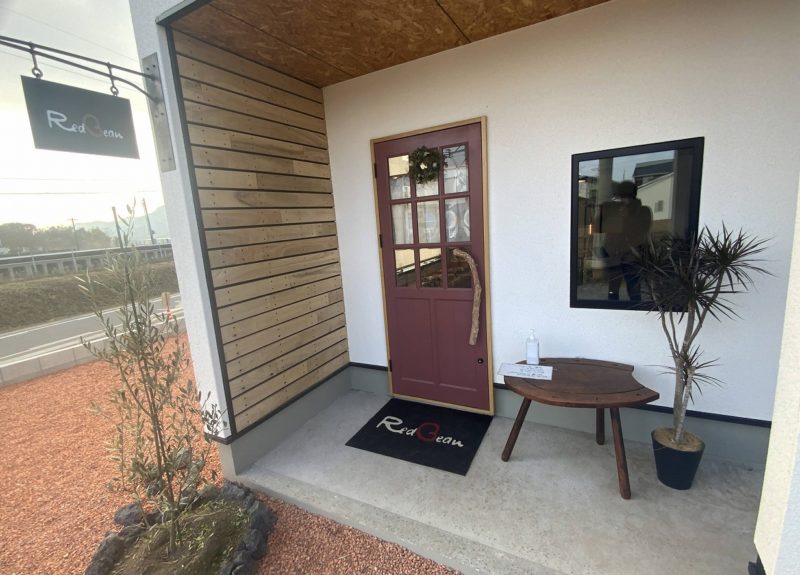 駐車場から階段をのぼると、おしゃれで落ち着いた赤い扉がお出迎え。