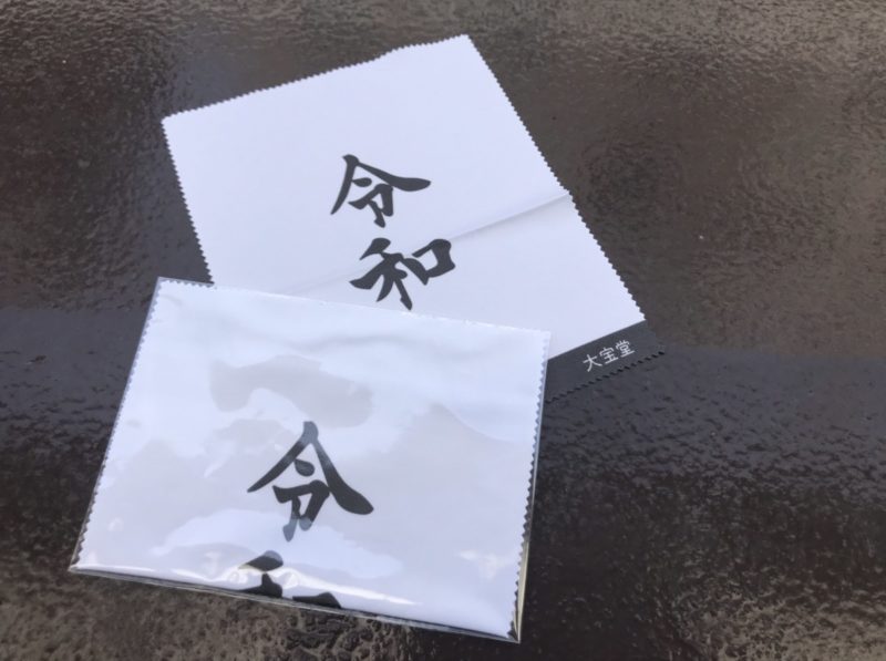 「令和」の文字が書かれたメガネ拭きも見せてもらいました!
