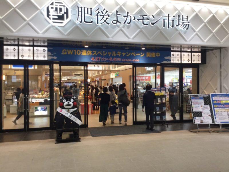 熊本駅に訪れると、肥後よかモン市場の前に立っているくまモンが「祝 令和元年」のタスキをかけていました。