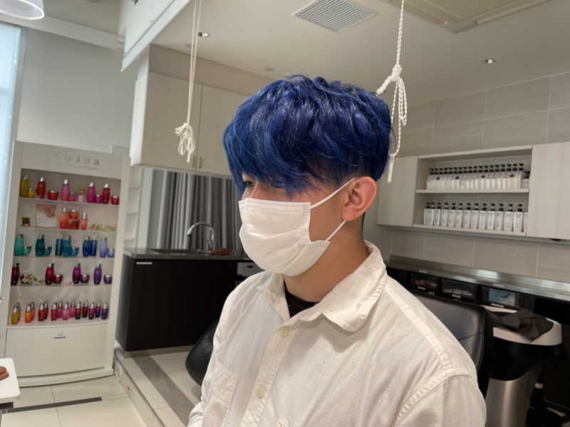 なんということでしょう。ブリーチをしただけのほぼ白の髪から深海のようなディープブルーに!