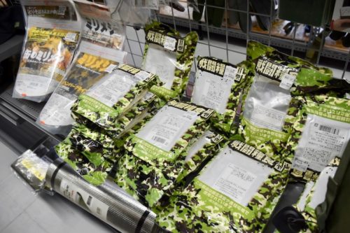 「戦闘糧食II型」と言う名の非常食。煮込みハンバーグや牛丼まであるらしいですよ。普段でも役立ちそう。