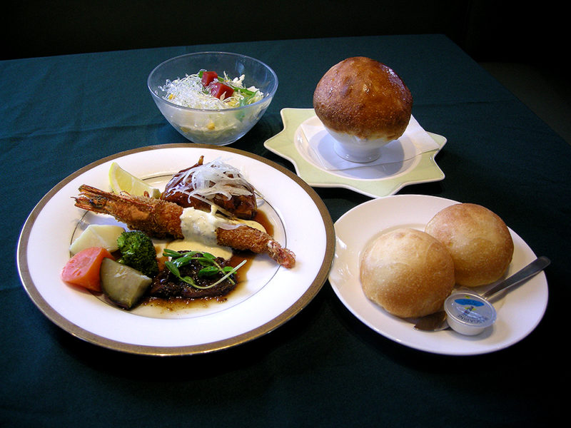 お店自慢の絶品手ごねハンバーグに、大きくて肉厚なエビフライ、ソース仕立ての絶品ステーキ、それに季節の新鮮な温野菜が添えられて、スープは創業当時から人気のきのこスープ!パンも生地からこねて作った完全自家製パンです!