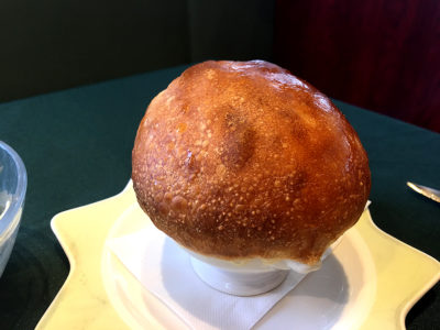 そして洋食スープといえばこの「きのこスープ」!今ではよく見かけますが、当時はぷっくりと膨らんだパンが衝撃でした。このパンをパカっと割って、中にあるコーンポタージュをいただきます。このパンにポタージュを漬けていただくのも美味しいですよね。