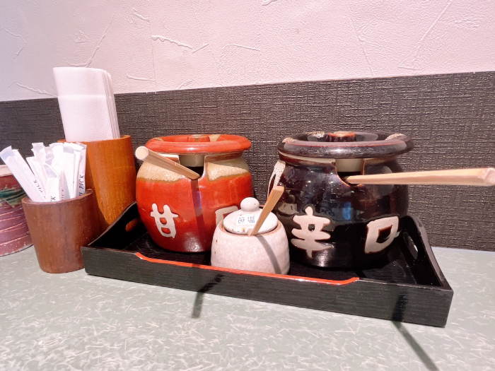最後に、テーブルに備え付けのソース。ソースは甘口と辛口の2種類があります。
