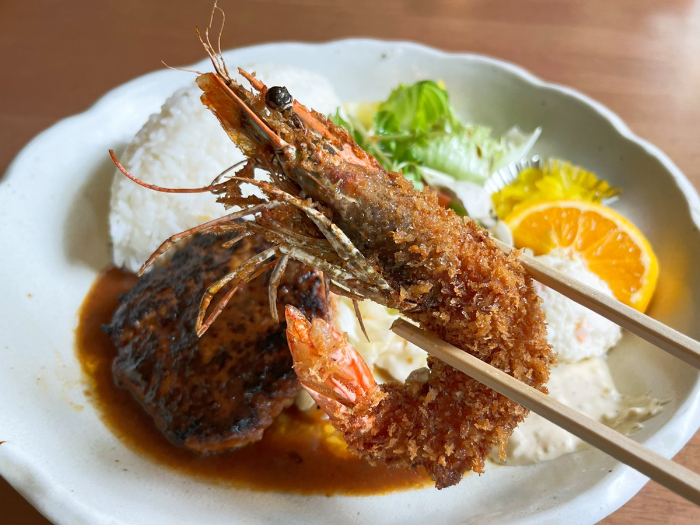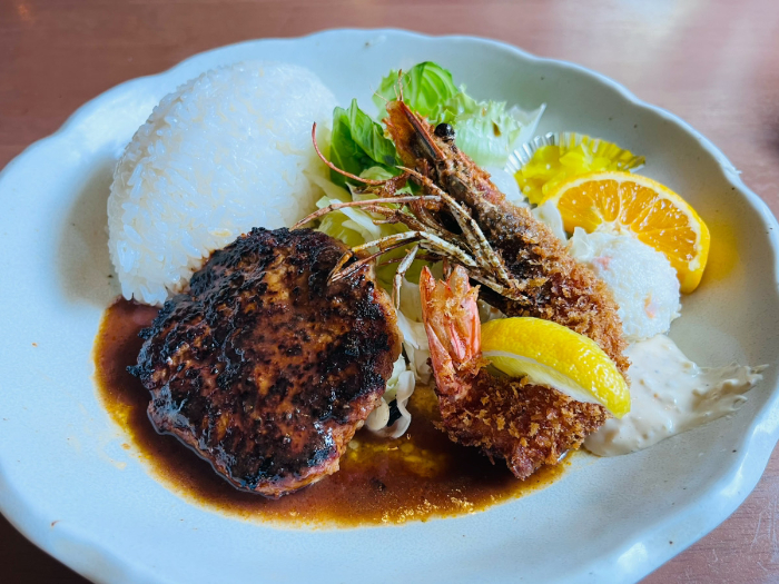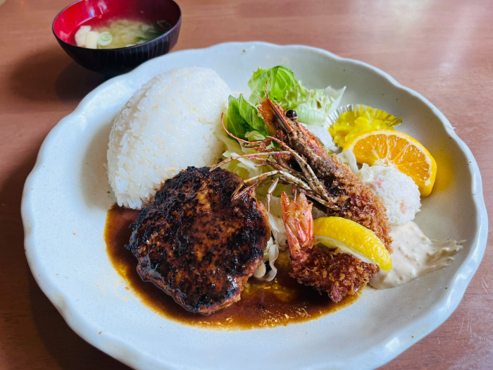 人気メニュー2つが一緒になった最強のハンバーグとエビフライ定食を注文。