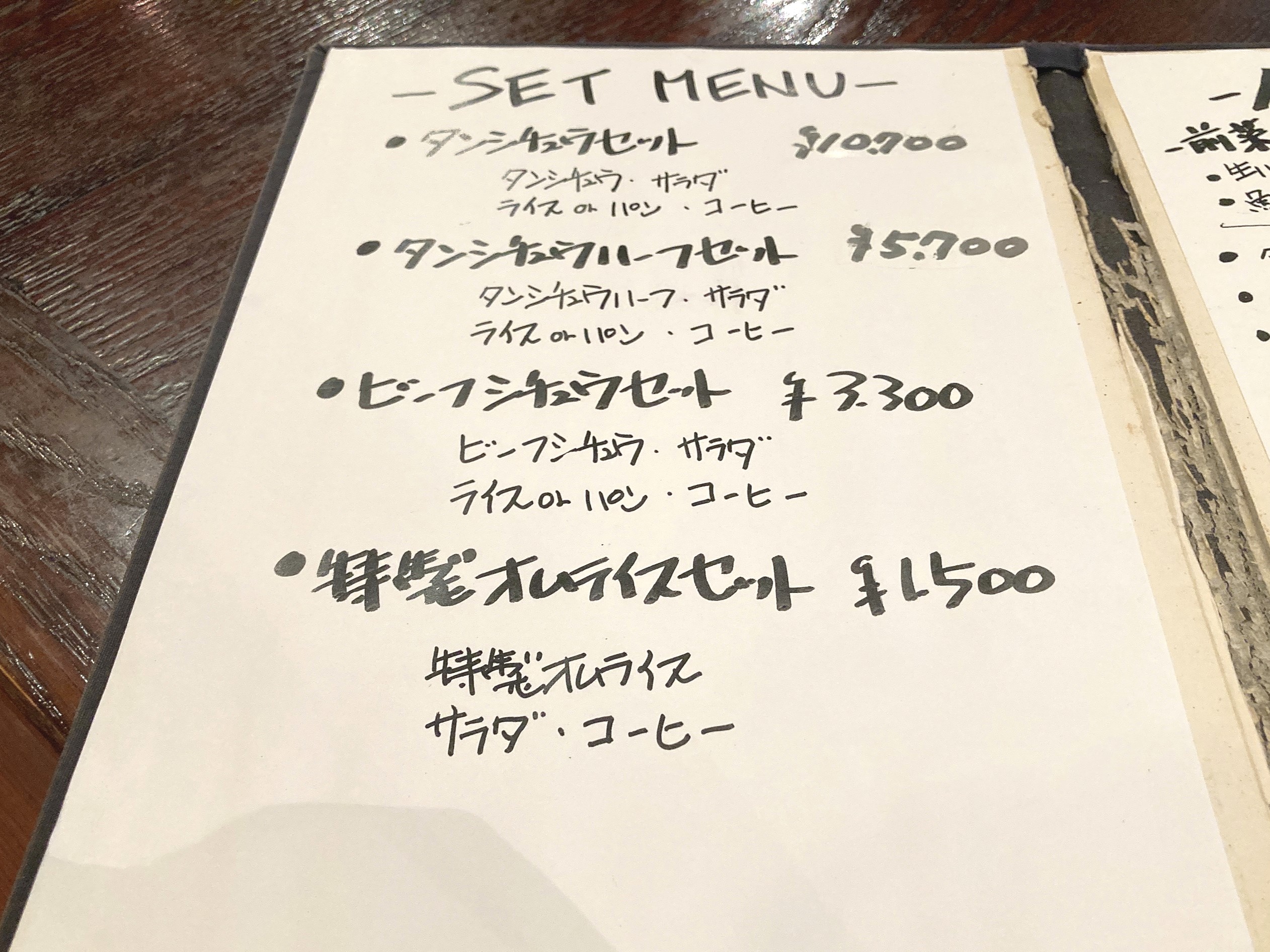 黒板以外にメニューブックもあります。最近はタンの仕入れ値が上がってしまって…と申し訳なさそうにおっしゃるお店の方。確かにタンシチュウはちょっと敷居が高いかも。でもいつか躊躇なくタンシチュウで!と言えるようになりたいです。