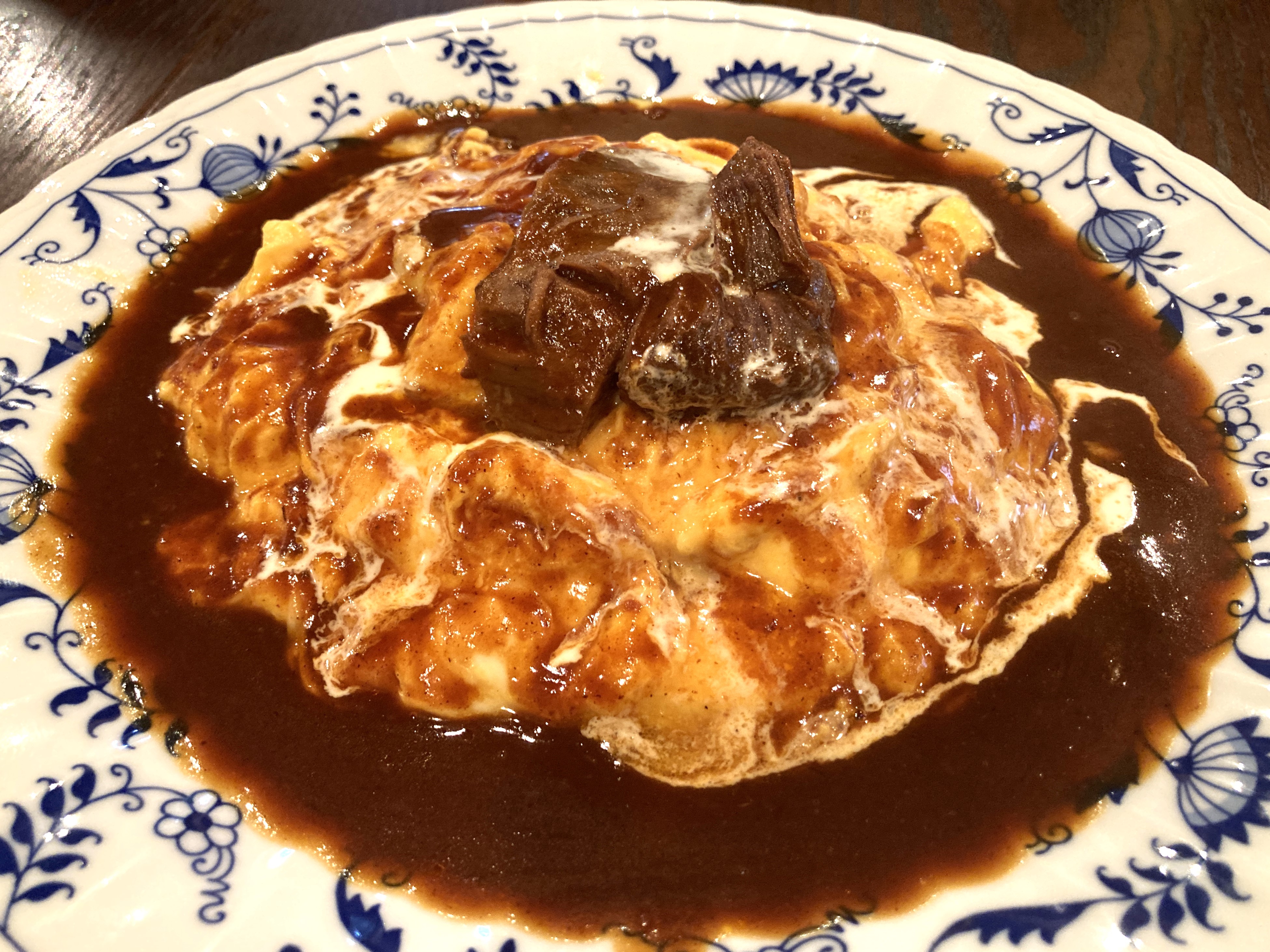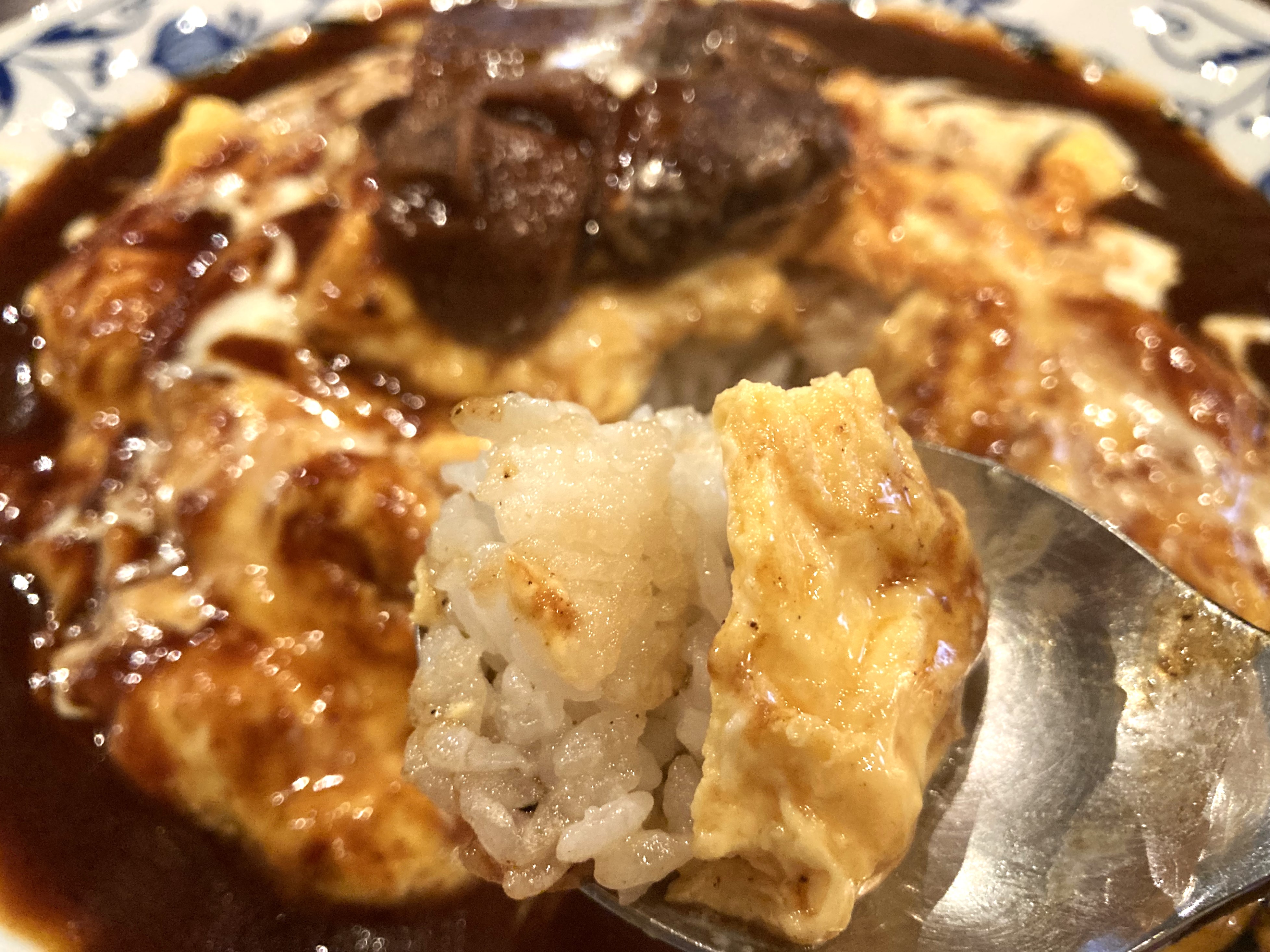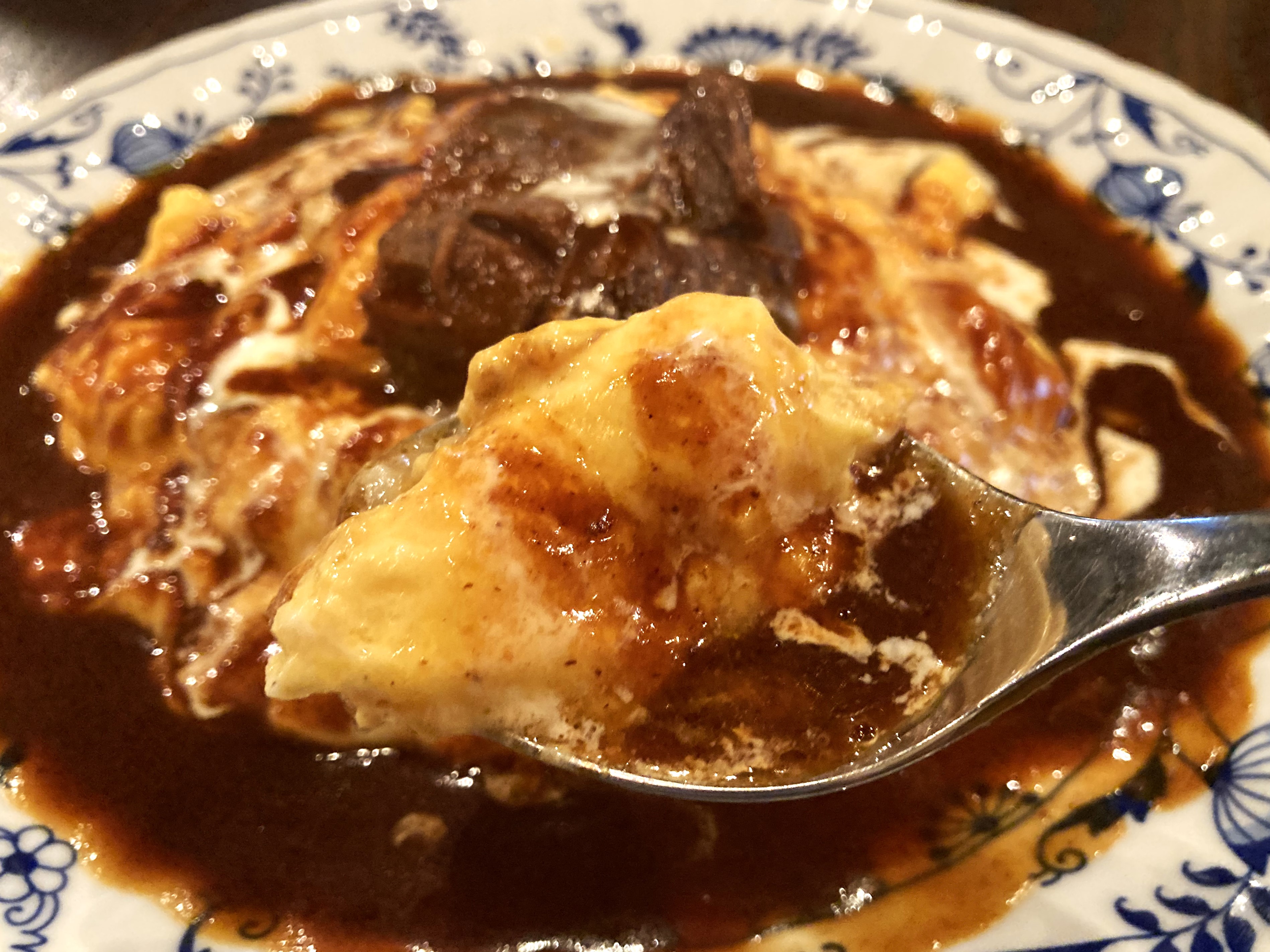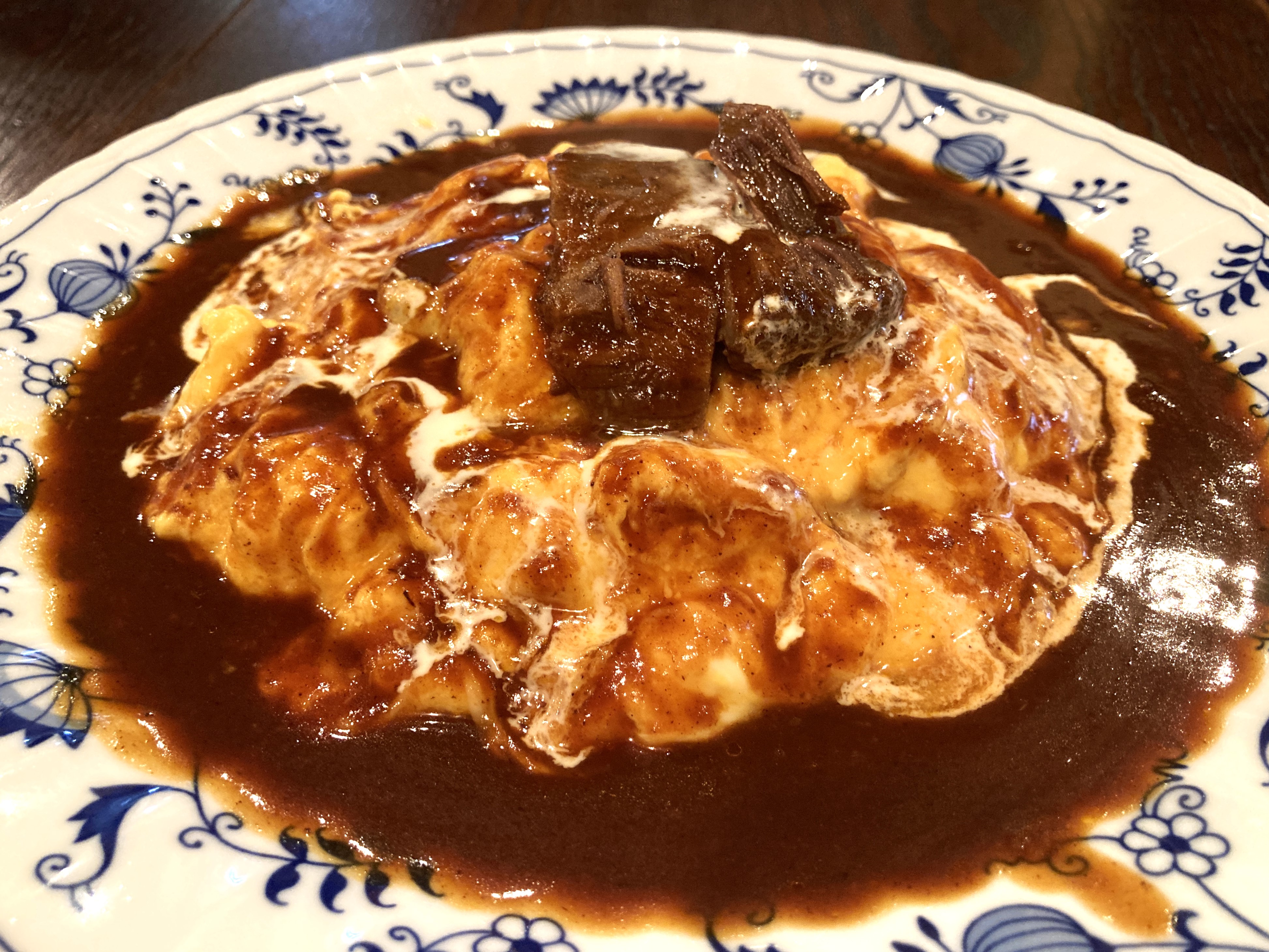 たまごの上にはたっぷりと掛かったデミグラスソースに生クリーム、そして牛ホホ肉。正解!まだ食べてないけど特製オムライスにして絶対正解!