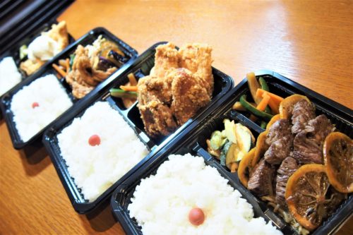 右手前から順に、牛カイノミステーキ弁当980円/Mixからあげ弁当680円